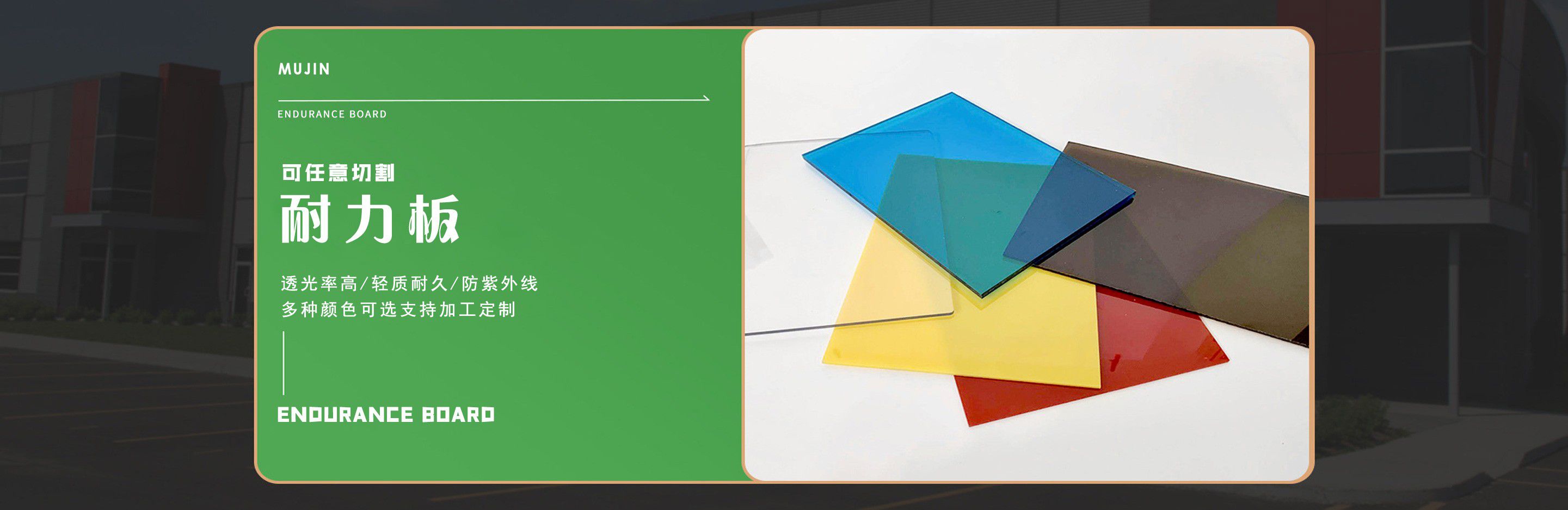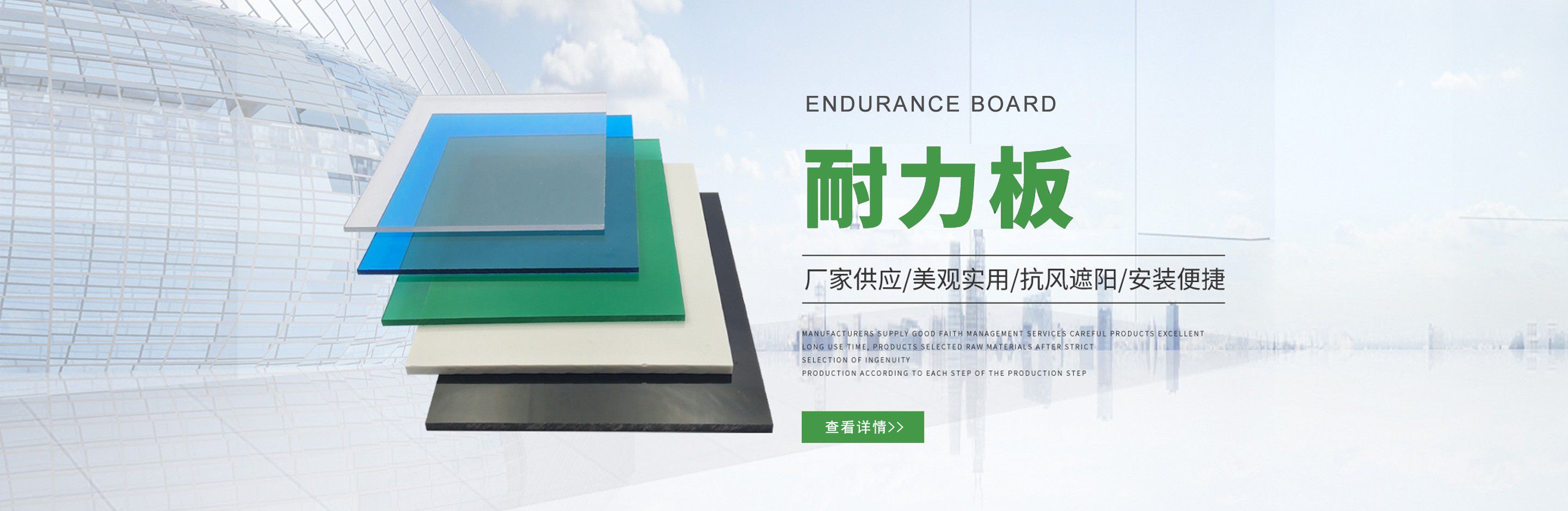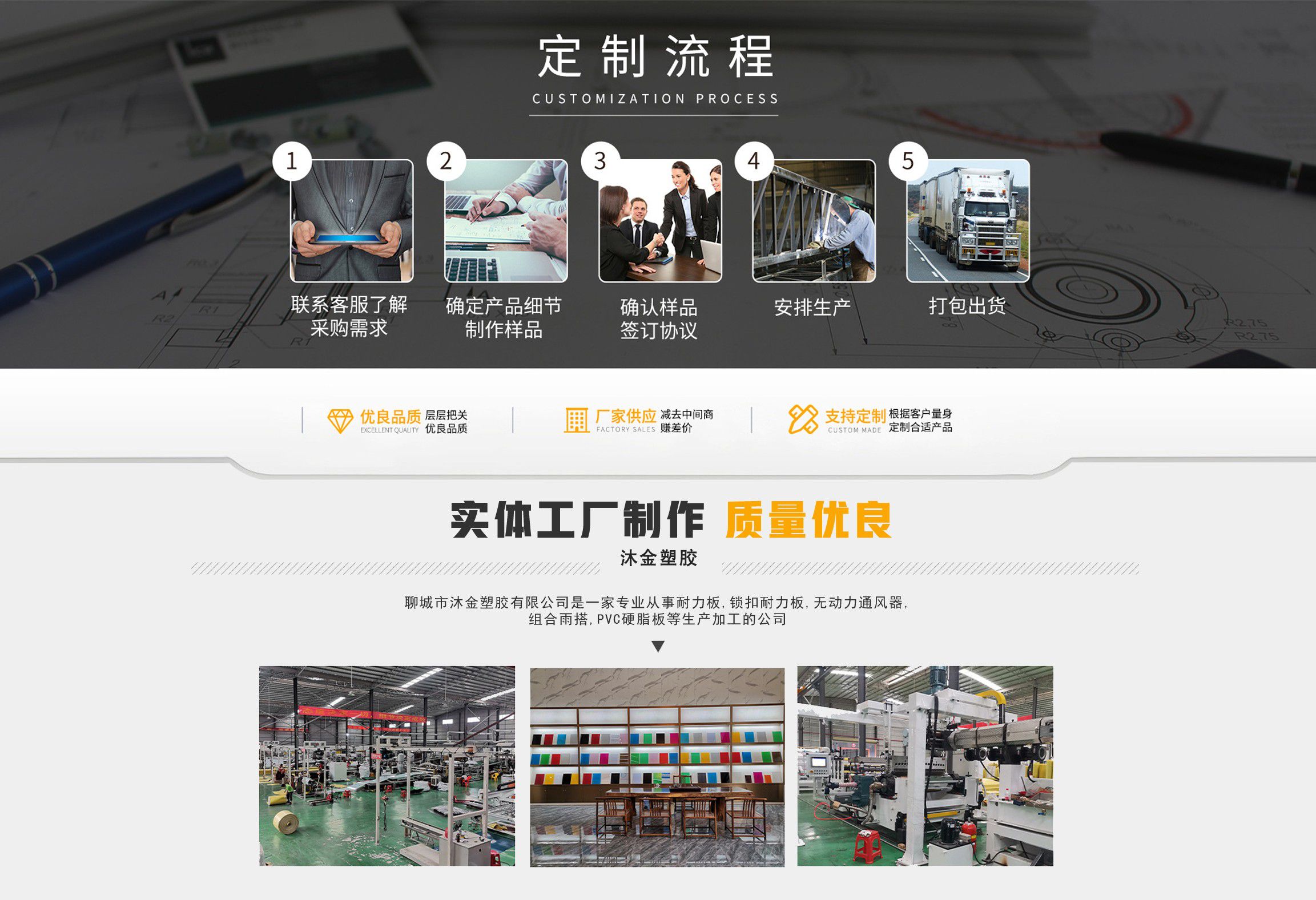 聊城市沐金塑膠有限公司注冊資金2180萬元,占地20000余平方,擁有自建廠房15000平方,員工100余名。10余年來,公司主營耐力板,鎖扣耐力板,耐力板深加工,無動力通風(fēng)器,組合雨搭,PVC硬脂板,耐力板廠家等板材的發(fā)展戰(zhàn)略,逐漸成長為綜合性企業(yè)?! 」緭碛卸鄺l板材共擠生產(chǎn)線,采用世界知名品牌進(jìn)口原材料和先進(jìn)工藝,依據(jù)完善的ISO9001質(zhì)量管理體系和ISO14001環(huán)境管理體系,為產(chǎn)品的卓越品質(zhì)提供了強(qiáng)有力的保證。憑借過硬的創(chuàng)新能力和堅(jiān)實(shí)的硬件基礎(chǔ),贏創(chuàng)已成為國內(nèi)領(lǐng)先的熱塑性板材生產(chǎn)商,產(chǎn)品被廣泛應(yīng)用于建筑業(yè)、農(nóng)業(yè)、工業(yè)、廣告業(yè)、安防行業(yè)及DIY領(lǐng)域?! 」臼冀K致力于通過提供最優(yōu)的板材應(yīng)用解決方案,為客戶創(chuàng)造最高的價(jià)值;堅(jiān)守創(chuàng)新、質(zhì)量、靈活、服務(wù)和速度的核心價(jià)值觀;堅(jiān)持“完美的產(chǎn)品需要完美服務(wù)的支持”的經(jīng)營理念,努力實(shí)現(xiàn)成為世界領(lǐng)先的板材與解決方案供應(yīng)商的夢想?! ≡谖磥?,公司將立足客戶需求,不斷改變和完善現(xiàn)有產(chǎn)品,拓展產(chǎn)品線和充分開發(fā)板材的應(yīng)用領(lǐng)域,為客戶創(chuàng)造全方位的價(jià)值。同時(shí)更好地實(shí)現(xiàn)員工的價(jià)值,實(shí)現(xiàn)公司團(tuán)隊(duì)的價(jià)值。我們將與您一起創(chuàng)贏未來! 企業(yè)使命:成為世界領(lǐng)先的板材與解決方案供應(yīng)商?! 」驹妇埃和ㄟ^提供最優(yōu)的板材應(yīng)用解決方案,為客戶創(chuàng)造最高的價(jià)值?! 『诵膬r(jià)值觀:質(zhì)量...